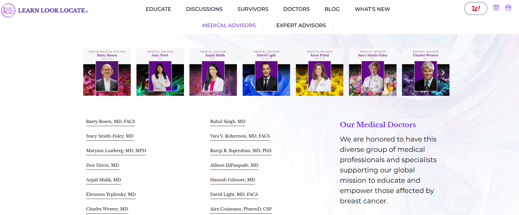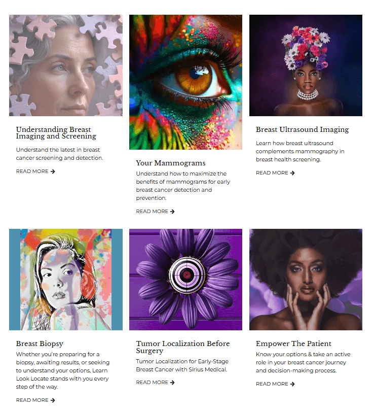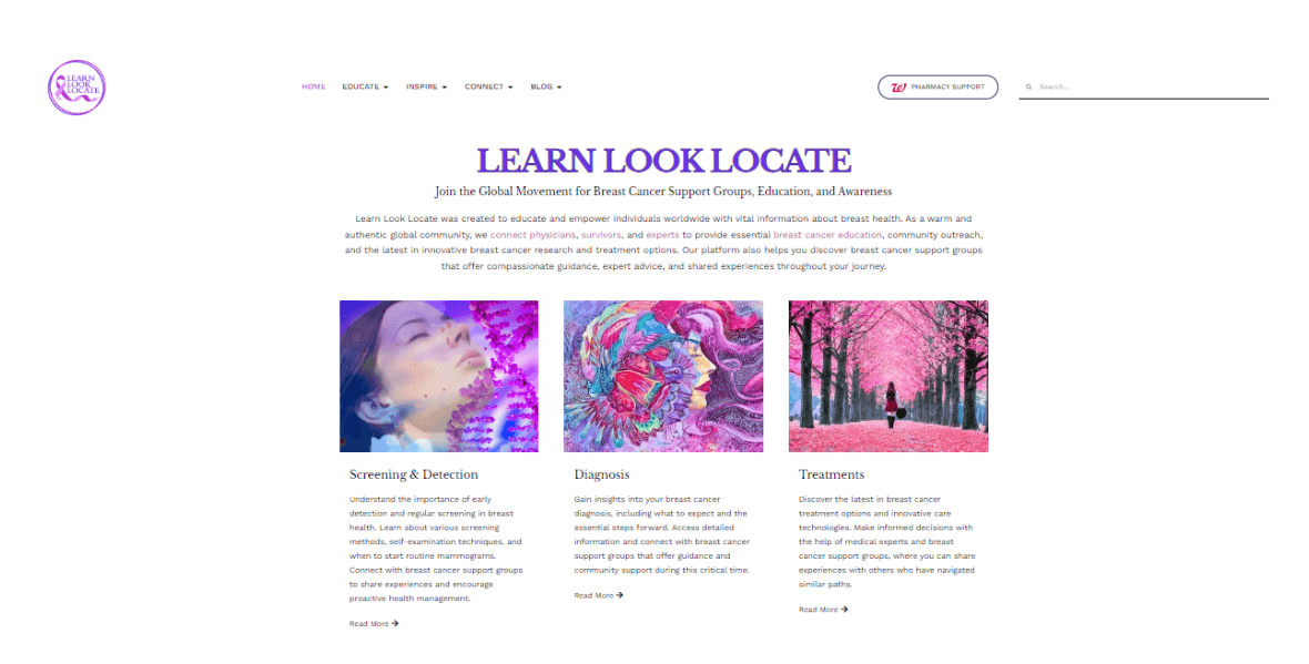 Homepage Transformation Redesigned hero section with clear value proposition: "Learn Look Locate was created to educate and empower individuals worldwide with vital information about breast health." Added immediate access to medical advisors through visual cards.